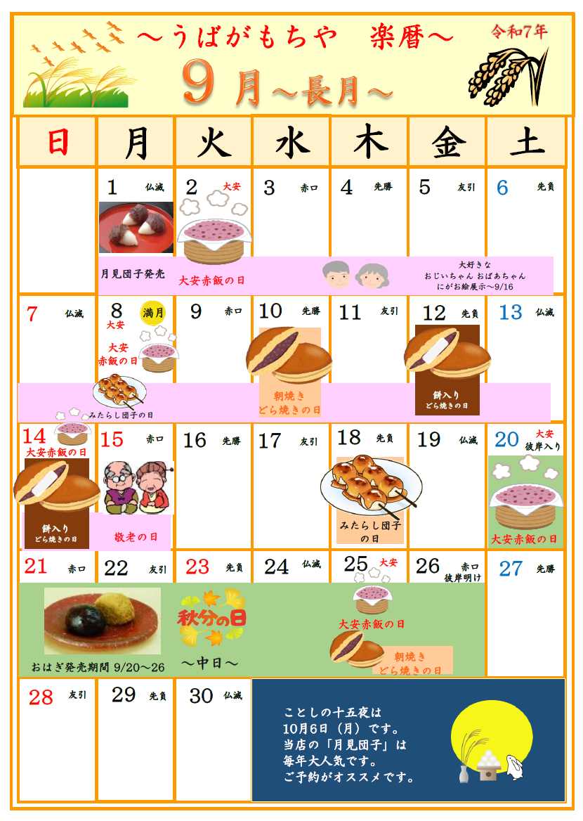 令和7年 9月のうばがもちやイベントスケジュールでございます。